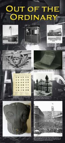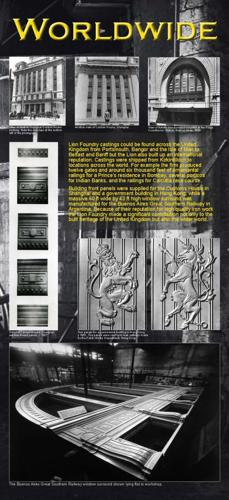 This panel shows some of the more unusual patterns and castings produced by the Lion Foundry. It also features an unusual advertising photograph for fire escape stairs - staff fill the street in front of the factory, line the fire escape on the side of building and even stand on the roof of the factory. |