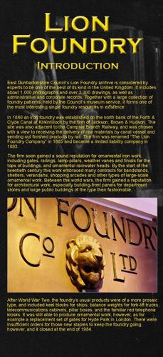 This online exhibition features a small selection of the Lion Foundry drawings, photographs and objects held by EDLC Archives and Local Studies, and the Auld Kirk Museum. The Archives collections includes the Lion Foundry business records, drawings, photographs, and trade catalogues. The Auld Kirk Museum has a permanent exhibition of Lion Foundry artefacts and also holds a large collection of the patterns used in the moulding process. Contact us to find out more.